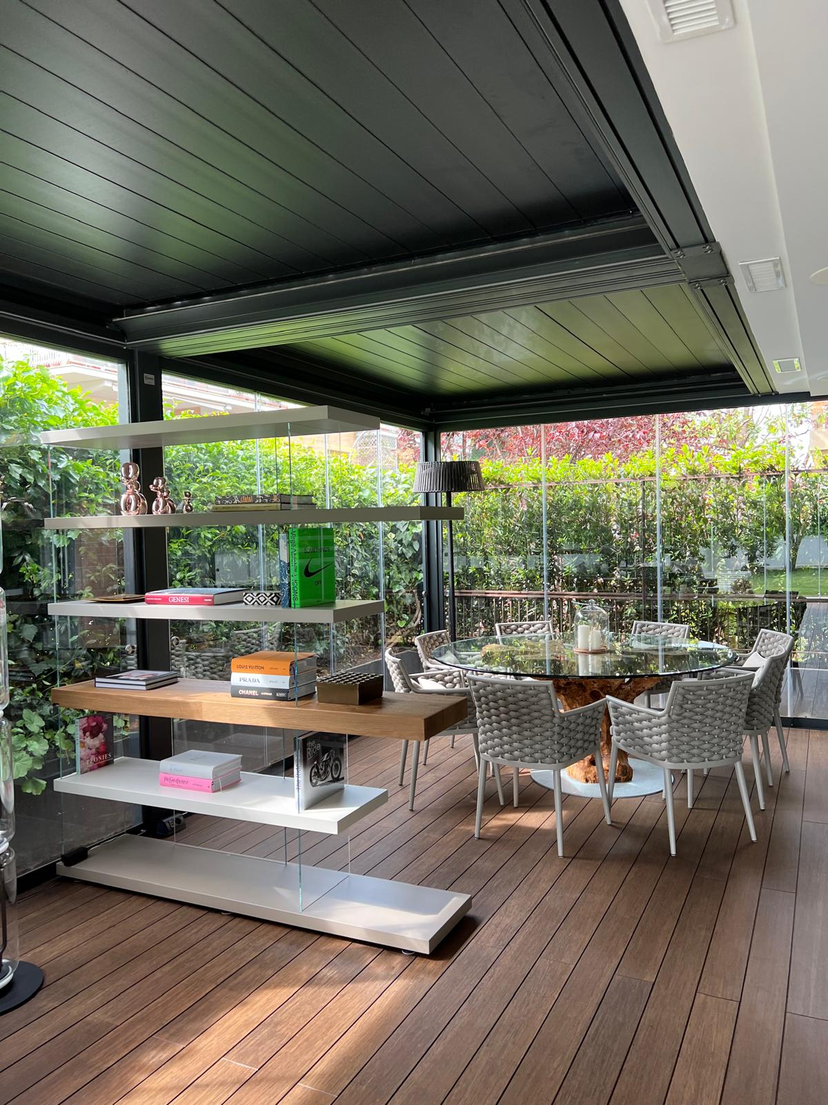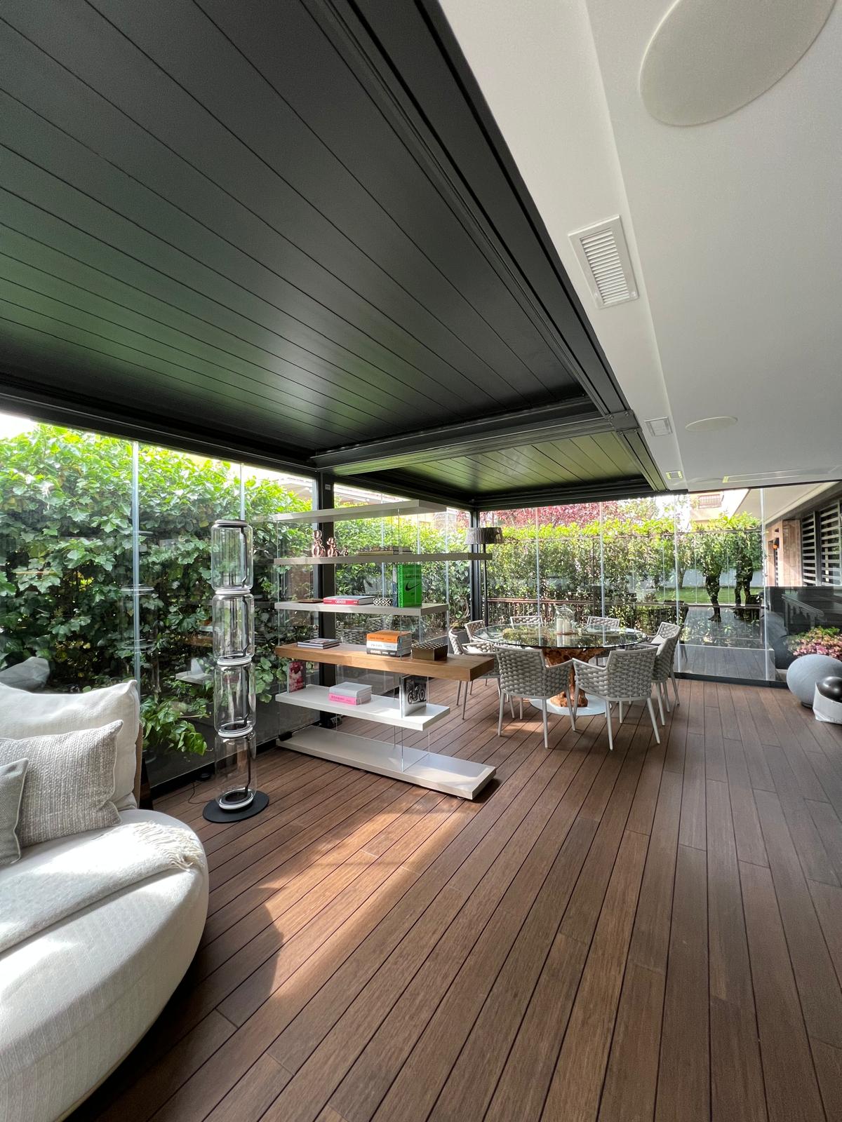 Uno degli elementi più distintivi del progetto è l’integrazione delle vetrate panoramiche scorrevoli, una soluzione che consente di chiudere completamente la pergola senza alterare la percezione dello spazio.