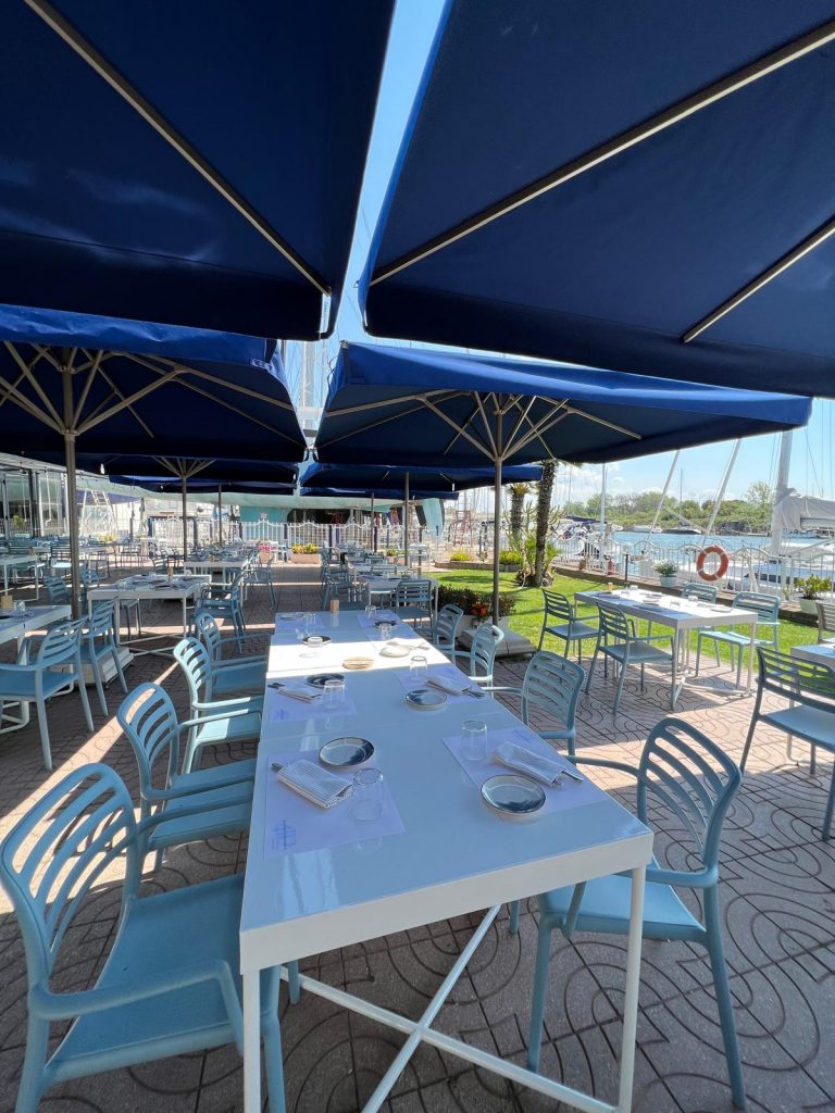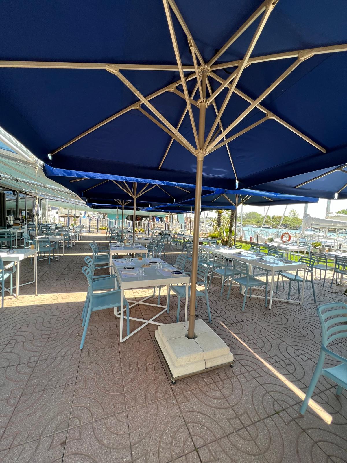 Gli ombrelloni si integrano perfettamente nello spazio grazie alle loro linee pulite e alla tonalità blu profonda del telo, che richiama il contesto marino e fluviale di Fiumicino, creando un’atmosfera rilassante e raffinata. La struttura a palo centrale consente una disposizione ordinata dei tavoli, ottimizzando gli spazi e garantendo libertà di movimento sia per gli ospiti sia per il personale di sala.