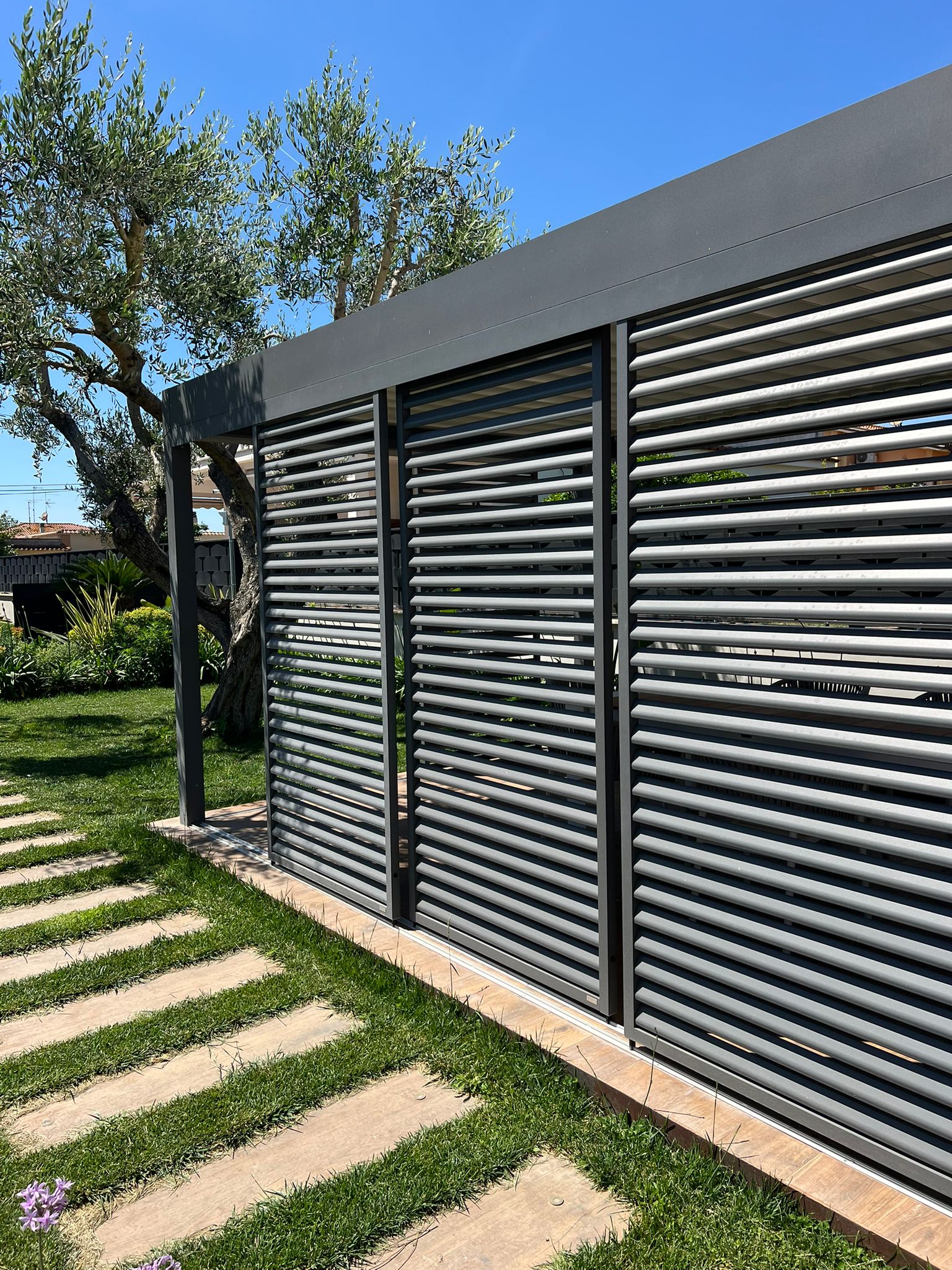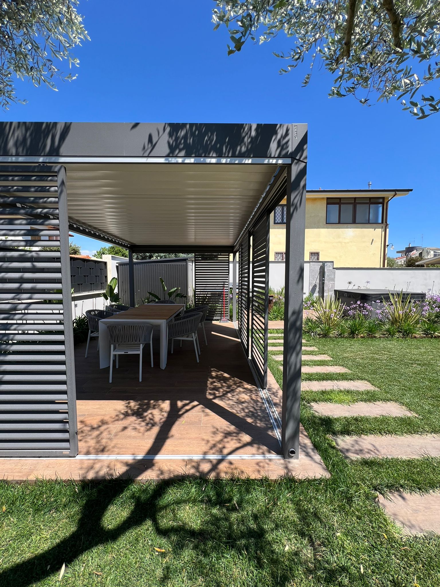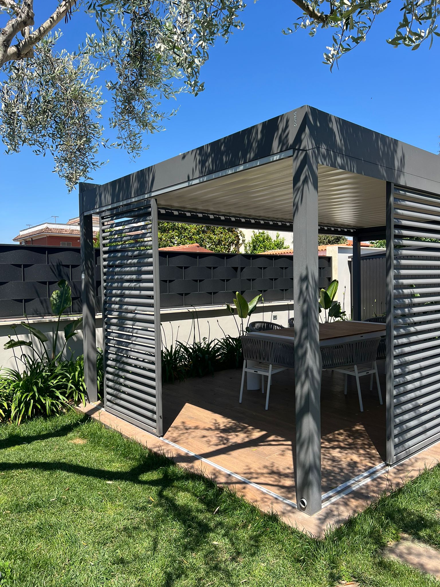 Uno degli elementi chiave del progetto è rappresentato dai brise-soleil scorrevoli Aura, installati sui lati della pergola per definire con precisione il grado di ombreggiatura e privacy desiderato.